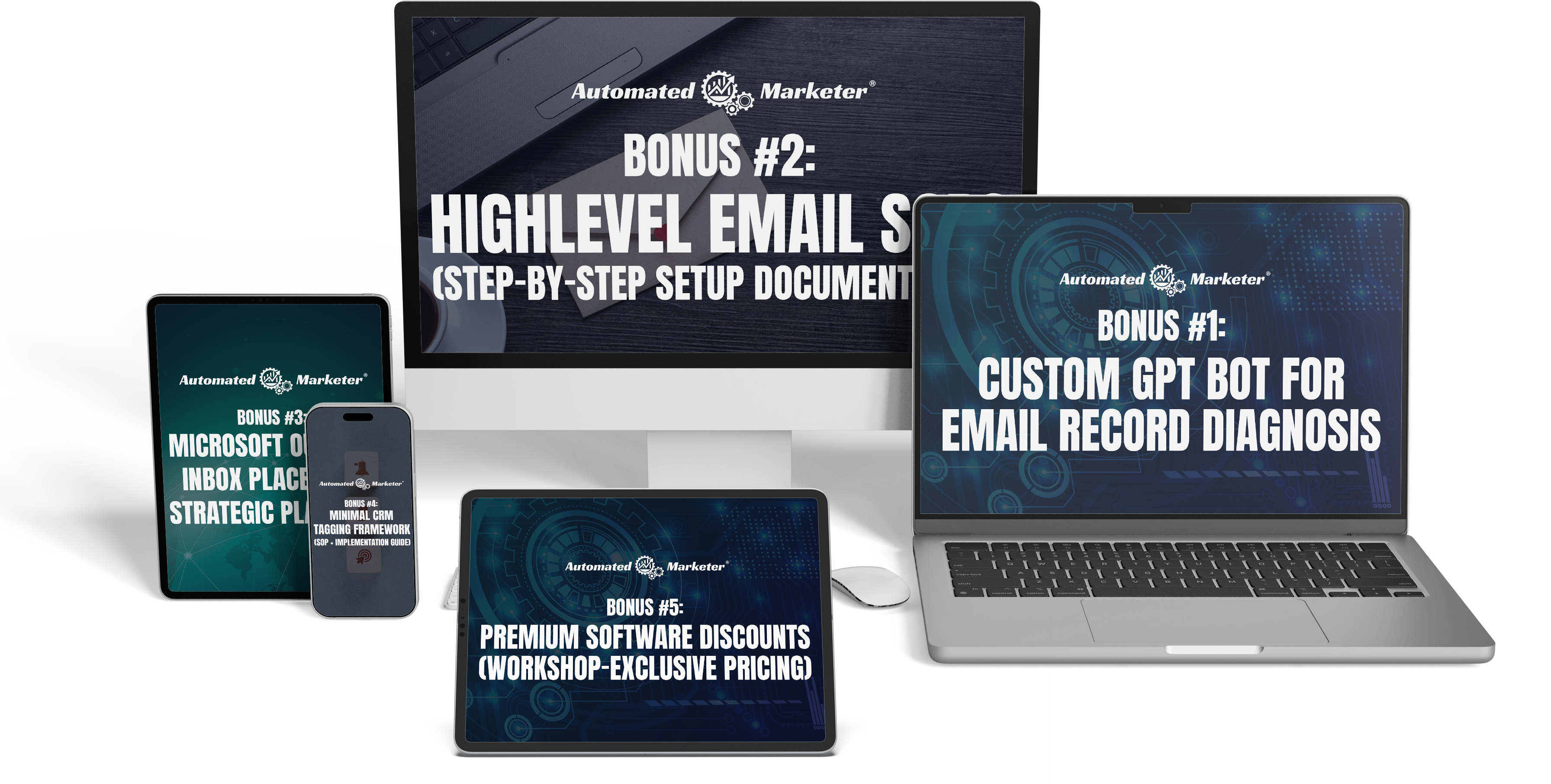 Email deliverability improvements depend on proper implementation of technical configurations (SPF, DKIM, DMARC), list hygiene, warmup protocols, and ongoing monitoring. We make no guarantees regarding improvement of your delivery rates, open rates, or business revenue as a result of attending this workshop.